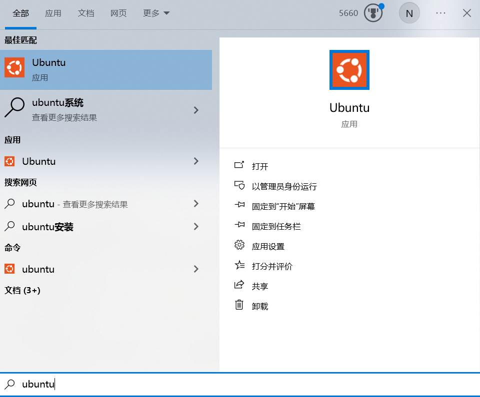 安装完 Ubuntu 后,在搜索栏可以找到Ubuntu: