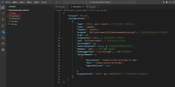 生成的 launch.json 包含多个配置。找到名为 "C/C++: g++ build and debug active file" 的配置(或者类似的,如果没有 preLaunchTask,就要手动添加)。
