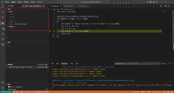 VS Code 会首先执行 preLaunchTask 中定义的编译任务。然后启动调试器,并在设置的断点处暂停。此时,可以看到左侧的"变量"、"监视"、"调用堆栈"等面板显示了当前程序的调试信息。