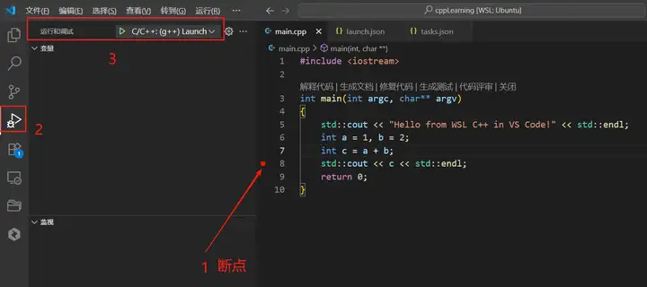 main.cpp文件的源代码设置断点。 - 点击左侧"运行和调试"图标(