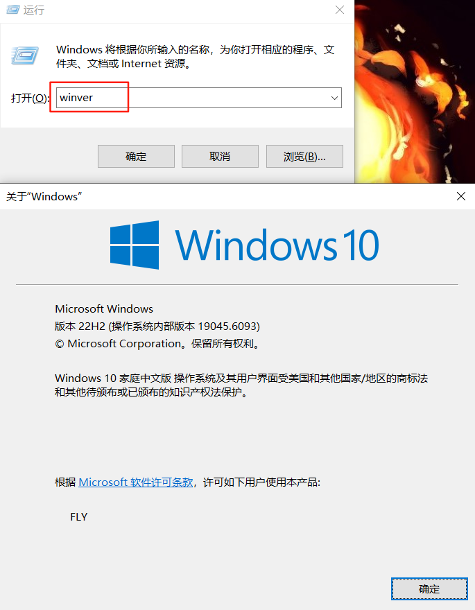 查看 Windows 版本和内部版本号:按下 Win + R 键,输入 winver 并回车。