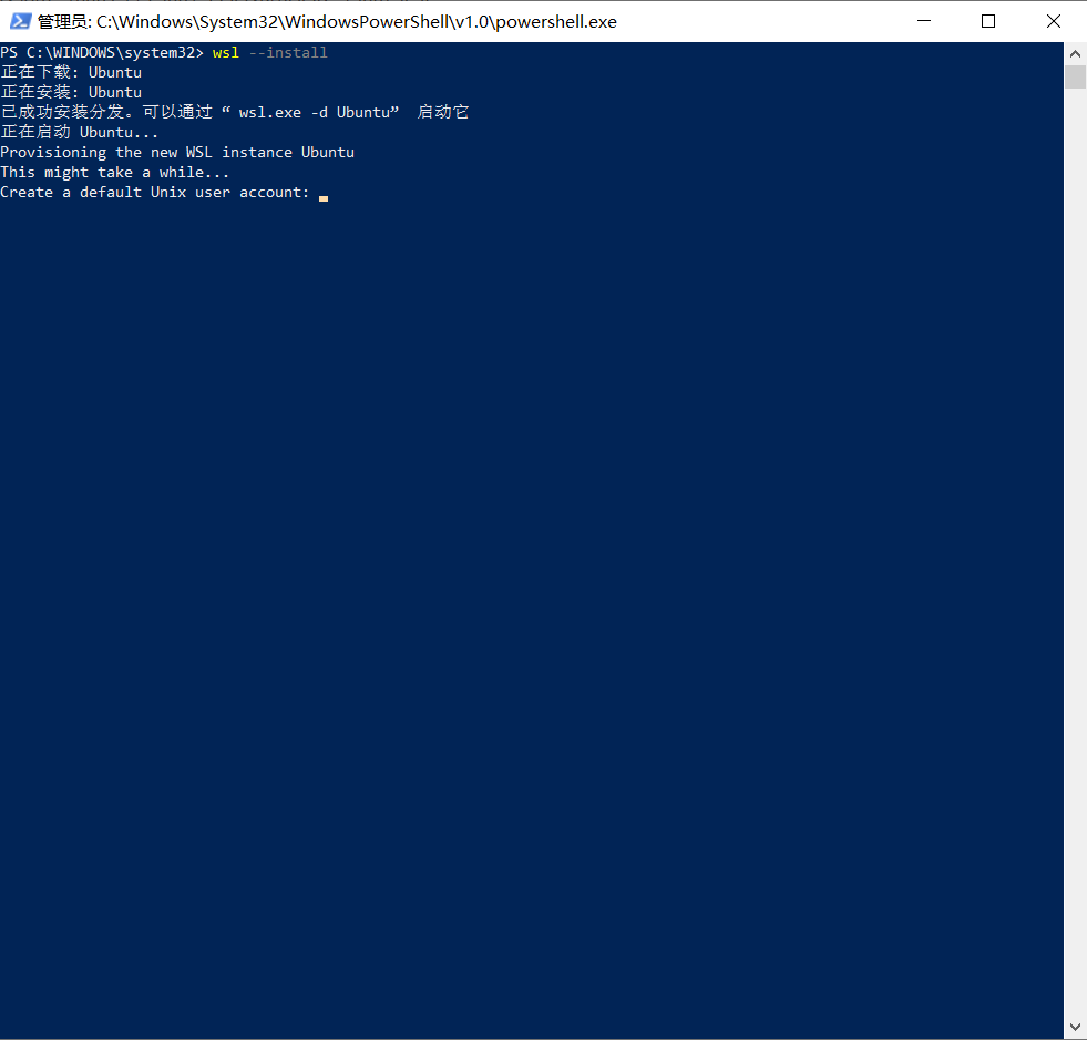 自动启用所需的 WSL 功能,并安装默认的 Linux 发行版(最新版本的 Ubuntu LTS)。