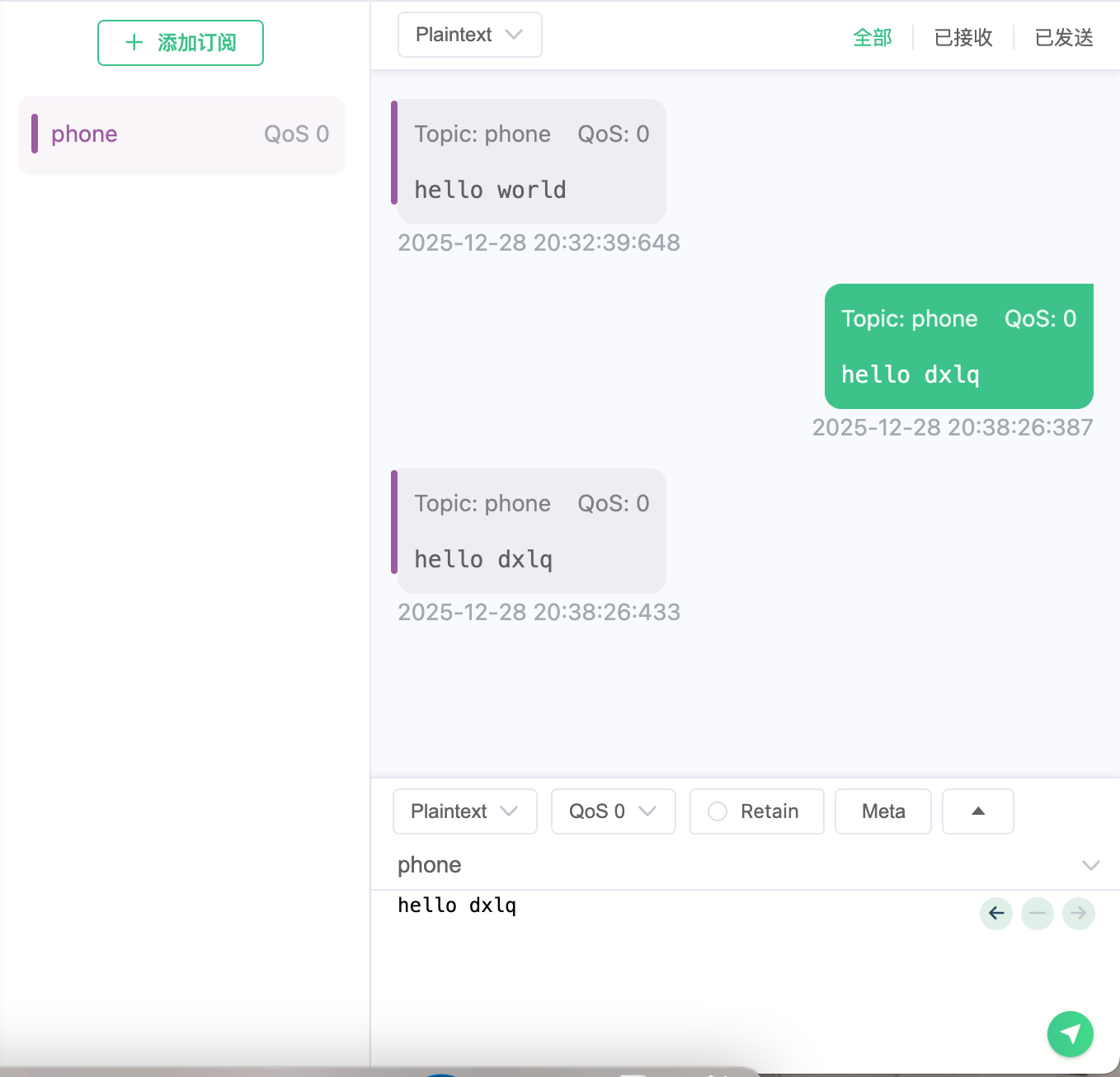 MQTTX 发布通知 hello dxlq