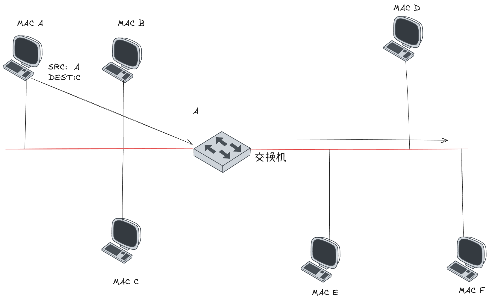 这时候交换机也不知道C在哪,因此当交换机收到A的报文时,也会将报文交给右边的区域。这时候以太网还是在同一个碰撞域。