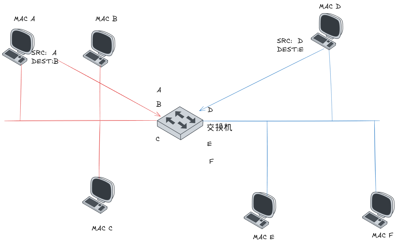这时候A向B发送报文,交换机就会知道A、B都在左边,因此不会将报文交给右边。这时候不会影响右边D向E通信。