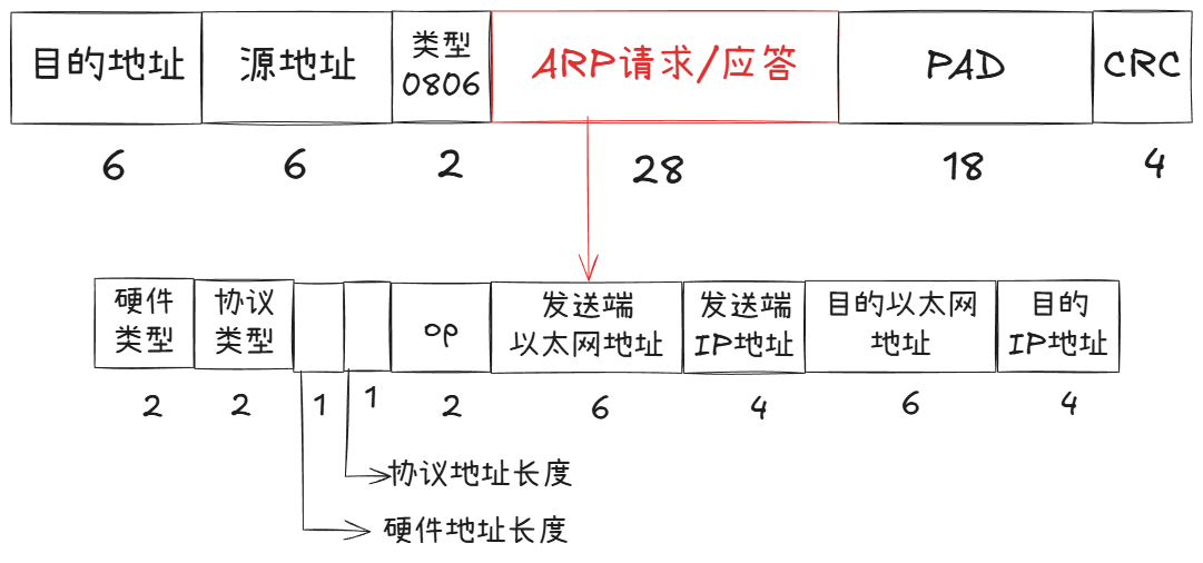 以太网帧的数据字段长度要求是 46~1500 字节(太短会导致传输效率低),而 ARP 请求 / 应答本身只有 28 字节,所以需要加PAD(填充字段)补到 46 字节,保证帧结构合法。