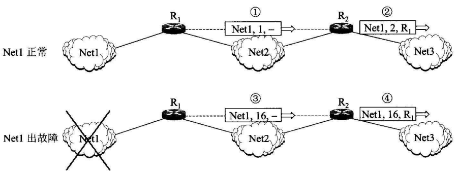 (距离是 16 就表示不能到达)。R2从另外的端口发送[Net1, 16, R1] ,表明"我到 Net1 的距离是 16, 经过 R1"。这样就使其他路由器很快都知道 Net1出了故障。
