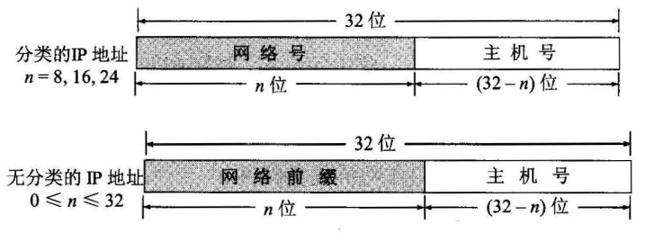 无分类地址又称为 CIDR 。由"网络前缀 "(network-prefix) (简称为"前缀")和主机号组成。主机号字段称为后缀(suffix) CIDR 的记法是:IP 地址::={<网络前缀>,<主机号>}。但网络前缀的位数不固定,并且没有 A类、B 类或C类的划分。图2是两种地址的比较。