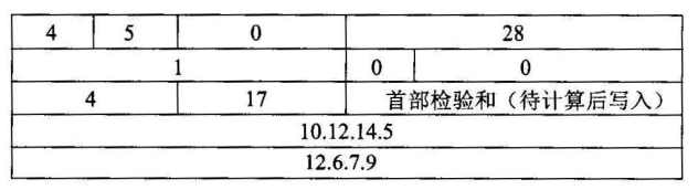 4-11 设IP 数据报使用固定首部,其各字段的具体数值如图 3所示(除 IP 地址外,均为十进制形式表示)。试用二进制运算方法计算应当写入到首部检验和字段中的数值(用二进制形式表示)。