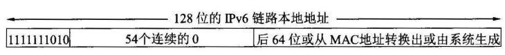 但IPv6 则不然。由于IPv6 的地址空间很大,因此 IPv6 对链路本地地址的处理方法不同。具体来说就是,只要主机一启动,其操作系统就自动生成一个IPv6 链路本地地址。虽然 IPv6的链路本地地址的网络前缀规定为 FE80::/10, 但实际上,这个地址的前 64 位中的后 54 位其实都是 0, 也就是说, IPv6 的链路本地地址的格式 定是下面所示的这样: