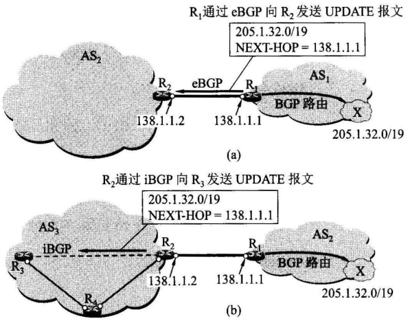 例如,在图26(a) 中, AS1的R1向 AS2 的R2发送的UPDATE 报文中,属性 NEXT-HOP=138.1.1.1 。这个地址对R2来说,确实是下一跳的地址。但在图 26(b) 中, AS3的R2 向本 AS 的R3发送的 UPDATE 报文中,属性 NEXT-HOP=138.1.1.1, 仍然是R1的 IP 地址。但这个地址对R3来说,显然不是下一跳的地址。R3 如果把这个地址写入自己的转发表中,则无法进行分组的转发,这是因为 AS3 的转发表是根据内部网关协议得出的,而内部网关协议并不知道本 AS 以外的情况。因此,路由器 R3 还必须进行一些递归查找,才能知道到达子网 的下一跳地址。