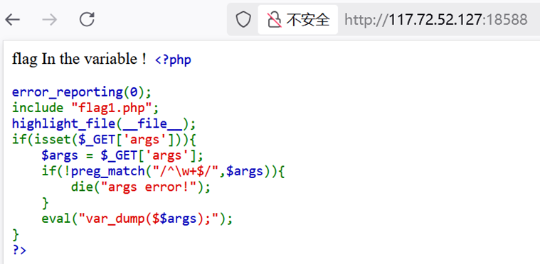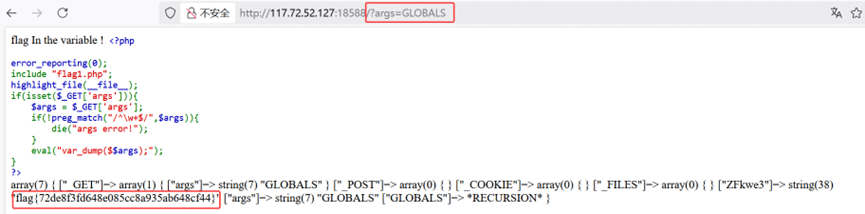 args="GLOBALS",所以args就变成了GLOBALS,而$GLOBALS是一个包含所有全局变量的数组。通过打印这个数组,我们可以直接看到flag变量的值,无需猜测具体的变量名。
