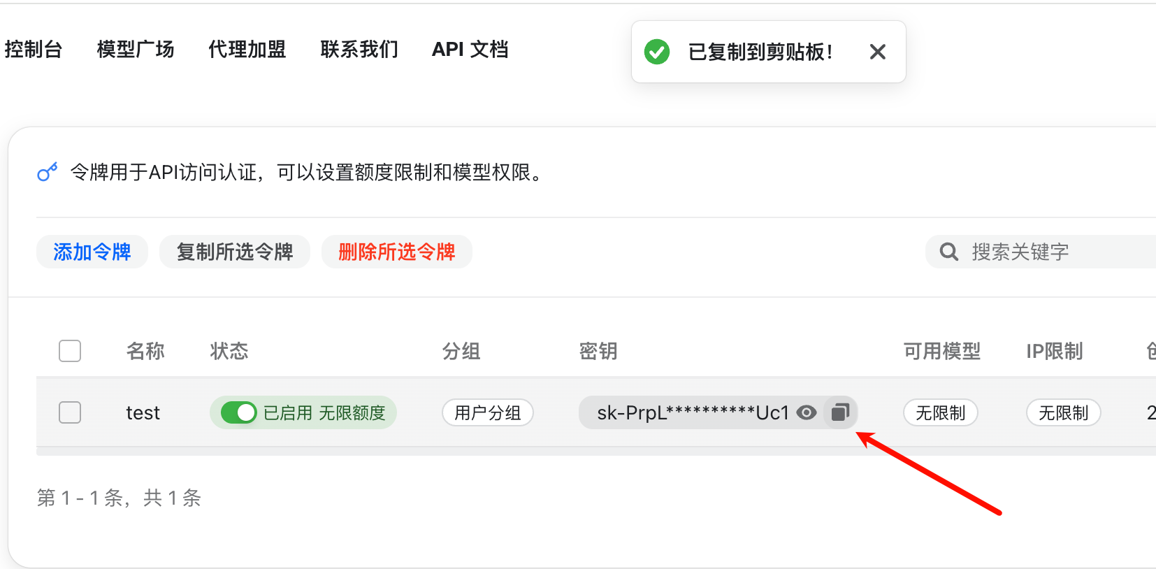 然后回到密钥处,这个时候你应该会默认就存在一个密钥了,如果没有就创建一个,之后将API-key复制下来,像下图一样粘贴到vscode里