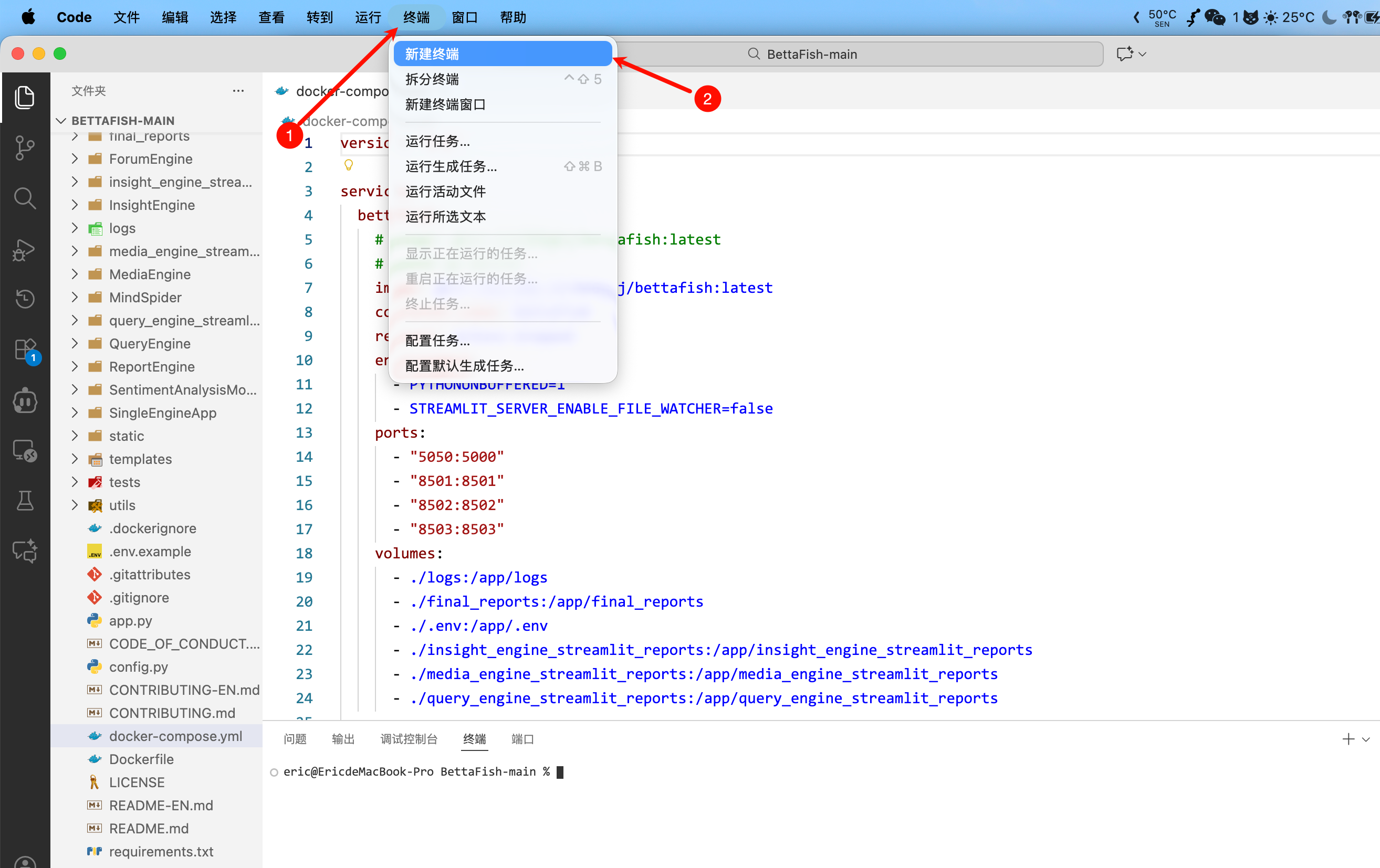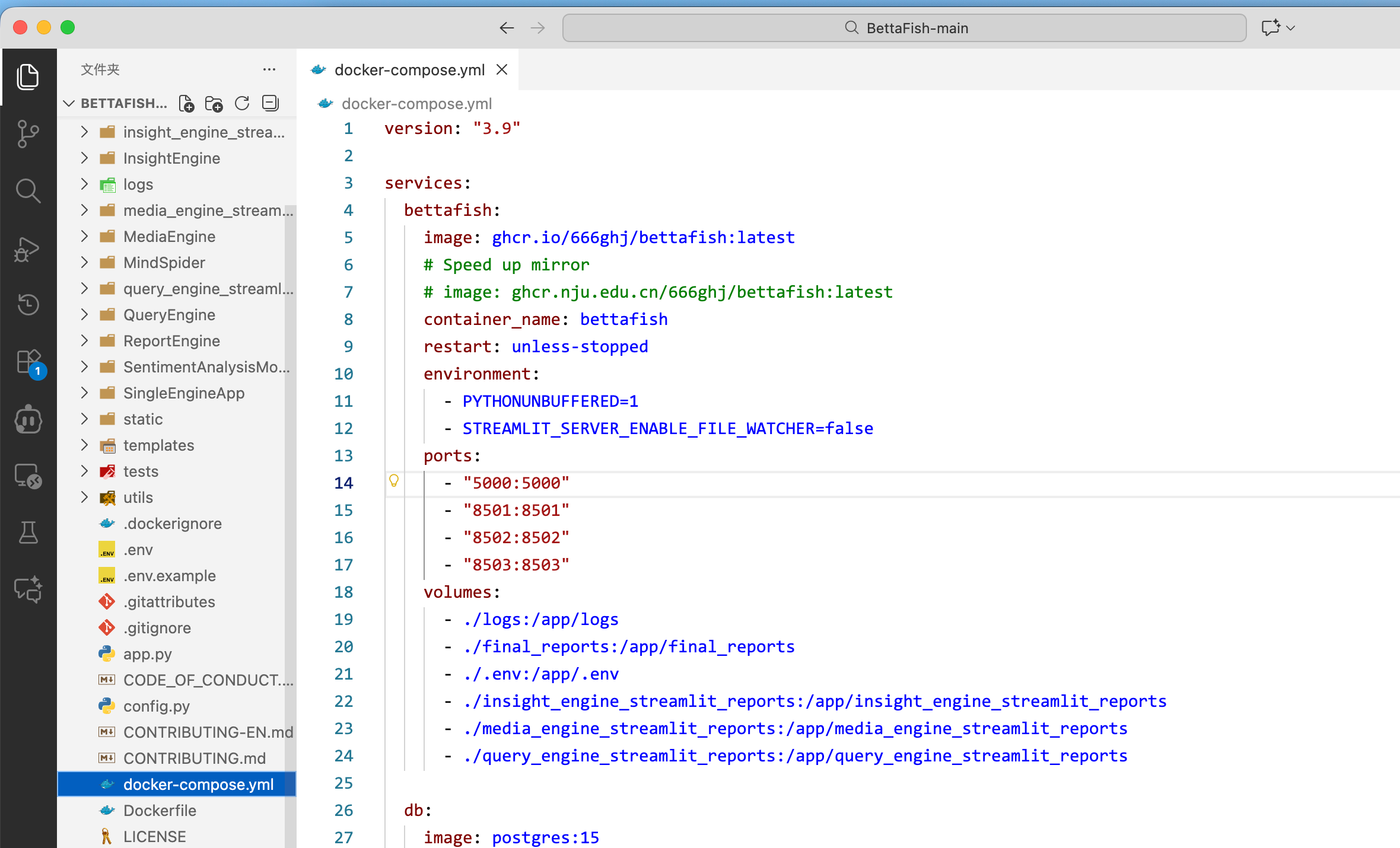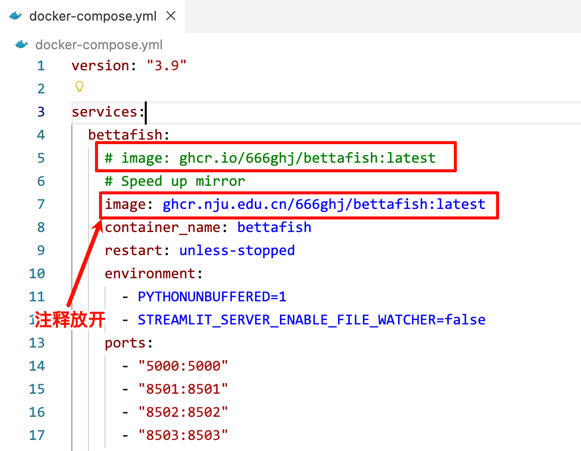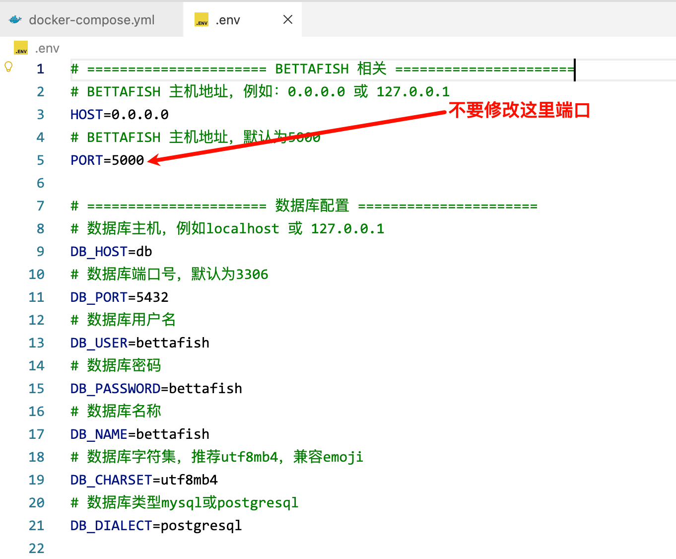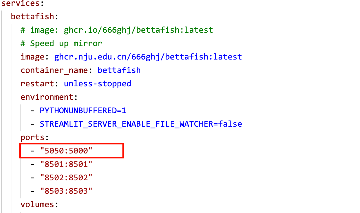 修改端口 ,我在部署的时候不知道为什么一直5000的端口是被占用的,所以在这里我们需要修改端口,记住,我们只需要在这个文件下修改端口 ,后面你也会看到另外的文件中出现端口,但是我们并不需要修改!