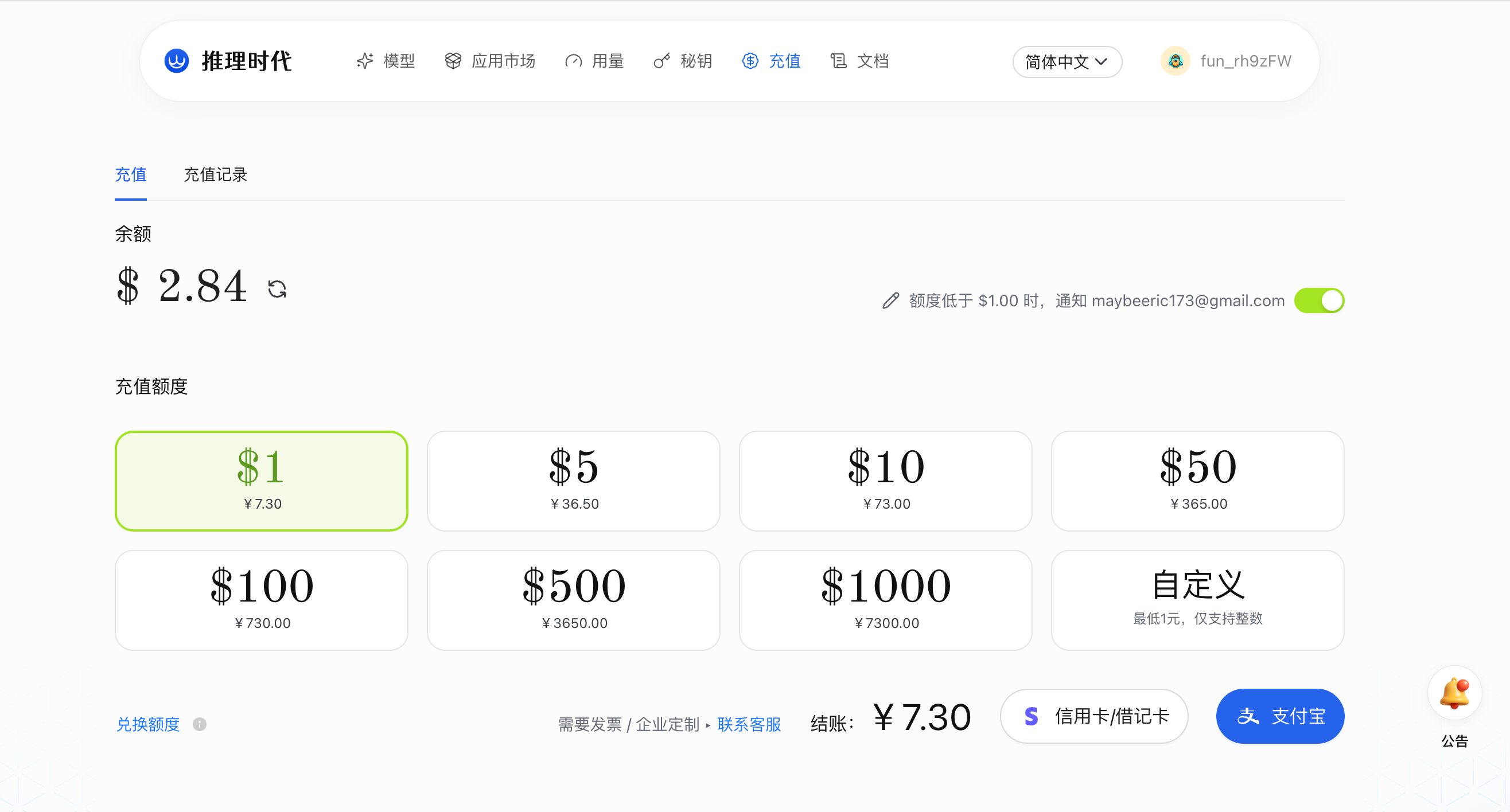 先去注册,然后打开上侧的密钥,进行充值,这里建议大家充值$3就够,差不多21RMB