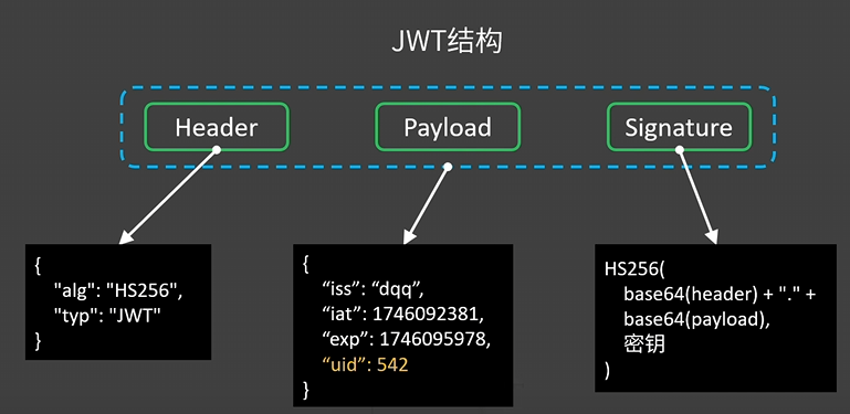 Payload:json字符串,包含通用信息(如发布者iss、发布时间戳iat、过期时间戳exp)和自定义属性(如uid)