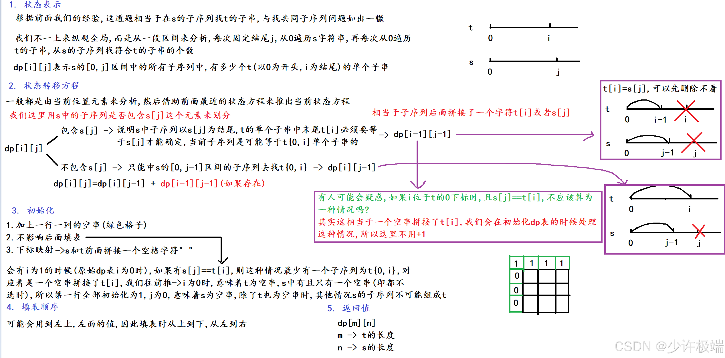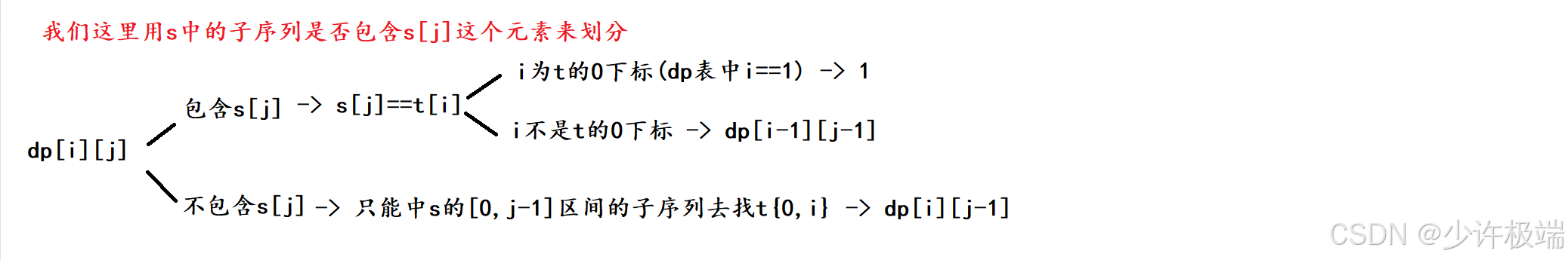 第二个是进一步细分的代码, 即我们不初始化dp表, 直接在填表的时候进行判断, 如果为第一行, 结果是用已经确定的一个子序列+从s的[0,j-1]区间符合条件的子序列个数