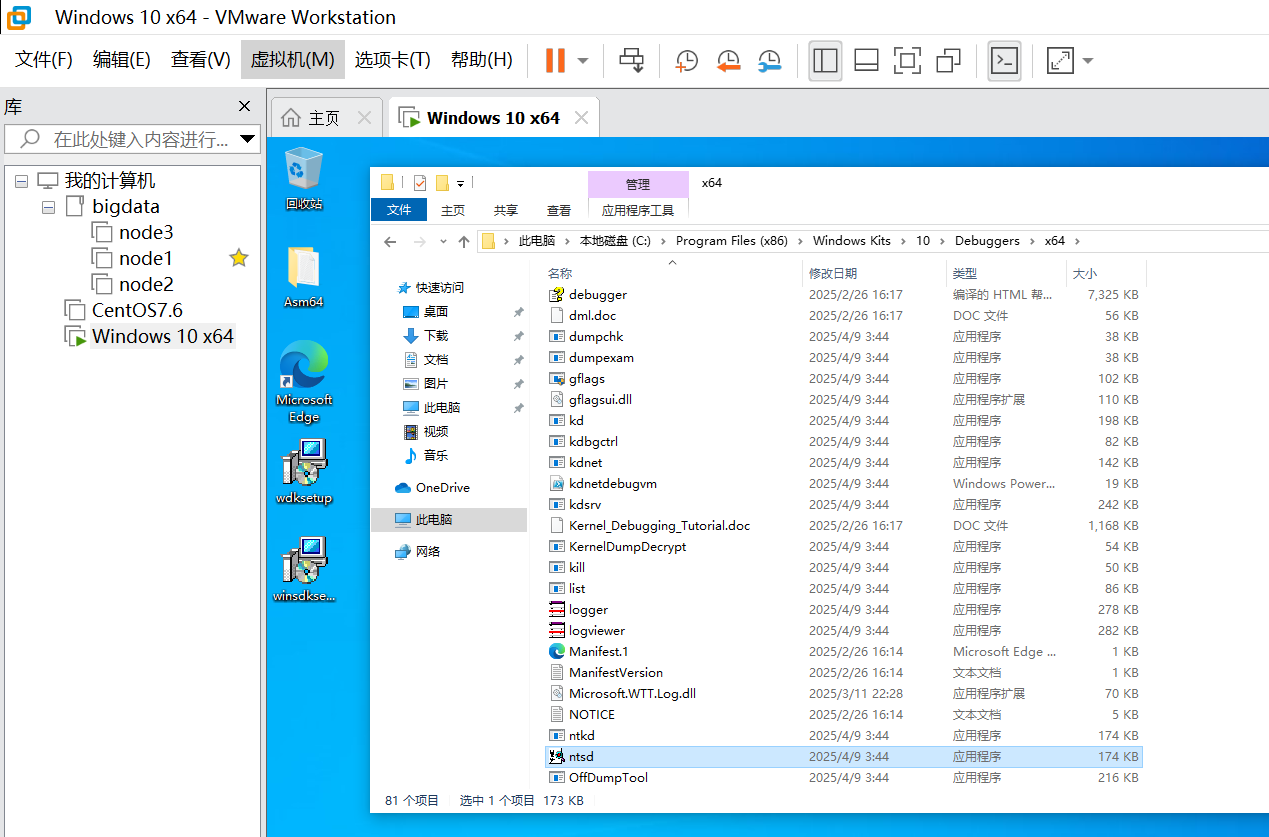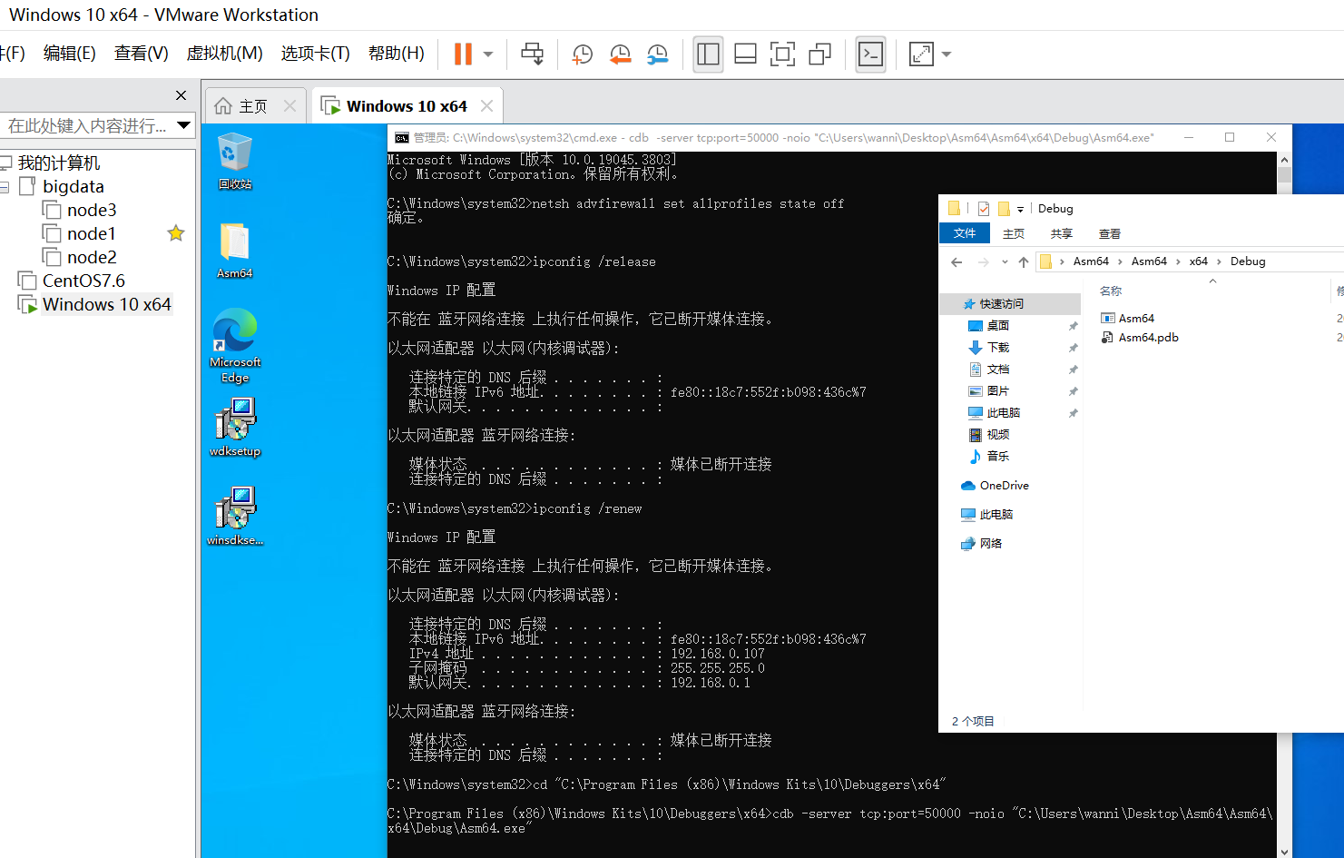 目标:在 主宿主机 上使用 WinDbg Preview 远程调试运行在 Windows 10 虚拟机 中的 Asm64.exe 汇编程序。