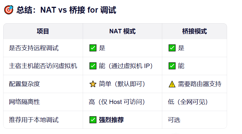 ❗ 但对 本地主宿主机 ↔ 虚拟机调试 来说,NAT 已足够,且更稳定、更简单