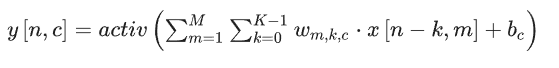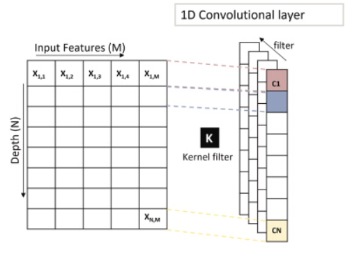 其中n = 1 ...,N,N 是深度层级长度;M 是输入特征的数量,且𝑐输出滤波器的数量(此处为30个)和K是卷积核的长度。该x[𝑛,𝑚]表示特定深度层的输入变量,而W𝑚,𝑘,𝑐以及𝑏𝑐分别参考权重和偏差。