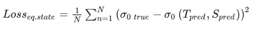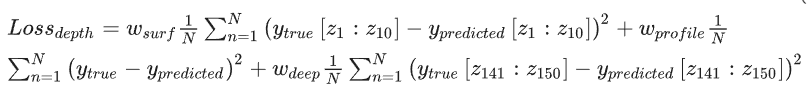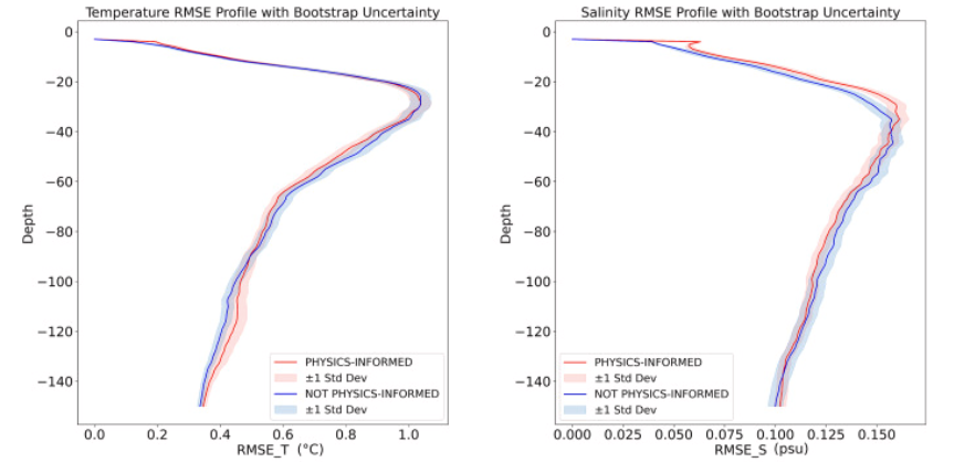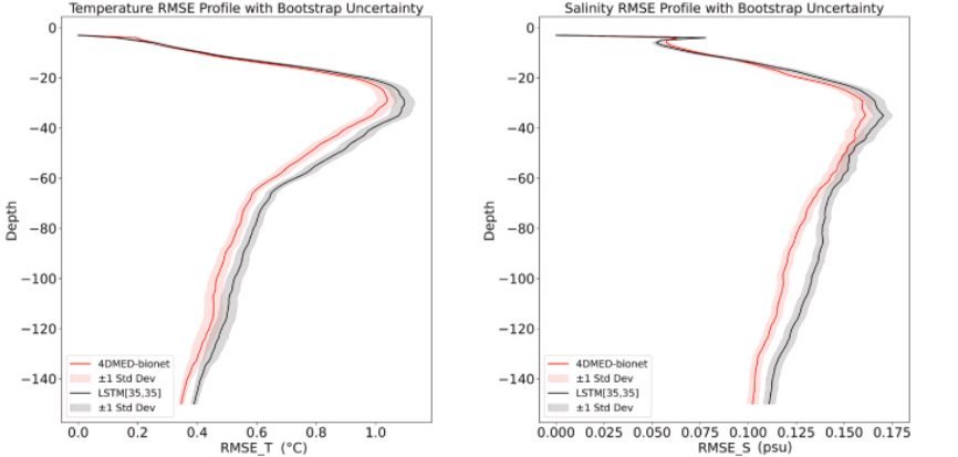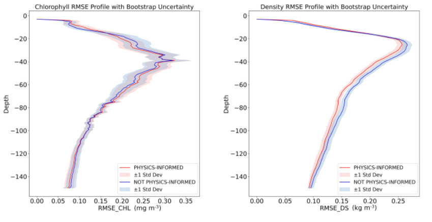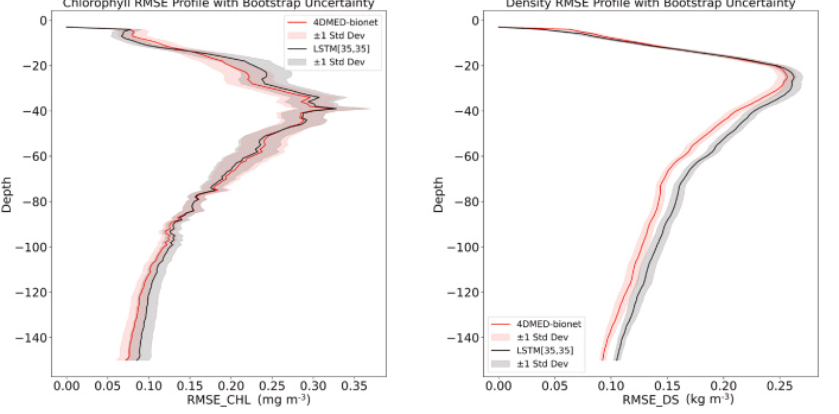 在展示使用混合Conv1D + LSTM架构而非简单堆叠LSTM时性能提升后,还研究了4DMED-生物网训练中包含这两个物理约束的影响。展示了两种不同情况下获得的密度RMSE:1)排除物理约束的运行(蓝线)与2)物理知情运行(红线)。虽然RMSE在温度、盐度和叶绿素方面差异较小,但当包含所有物理约束时,密度预测的准确性有所提升。因此,实现物理知情损失函数减少了密度误差,同时不影响其他变量。