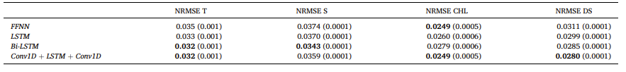 不同架构的比较基于归一化均方根误差(NRMSE),该误差对四个生物物理变量的范围进行了归一化,同时也基于RMSE分布随深度变化的评估。(不同模型架构验证结果的比较:FFNN、Bi-LSTM、LSTM和Conv1D + LSTM + Conv1D。)