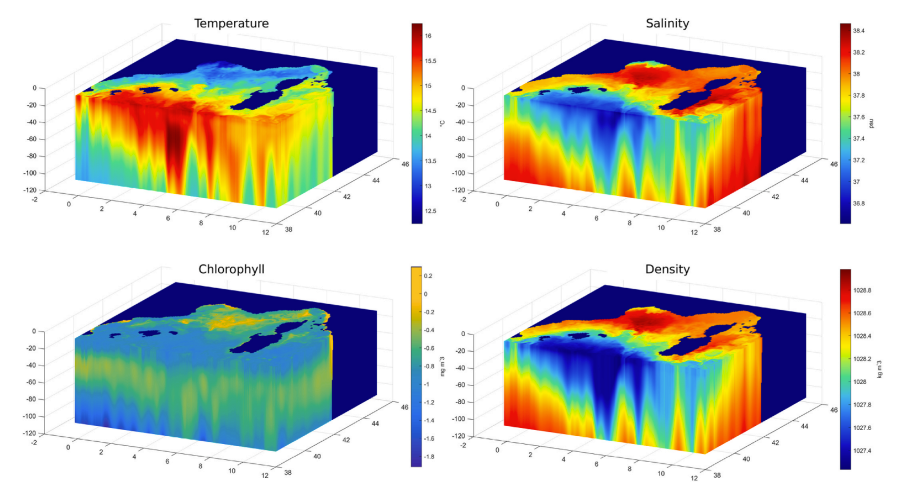 重建后的四维场分布在规则网格上,横向空间分辨率为经纬度均为1/24°,设有148个垂直层级,深度从3米到150米,间隔1米,时间分辨率为1天。空间范围从6°W延伸至36°E,时间覆盖范围自1月1日开始2016年至8月1日, 2022。如下重建后的4D生物物理变量。
