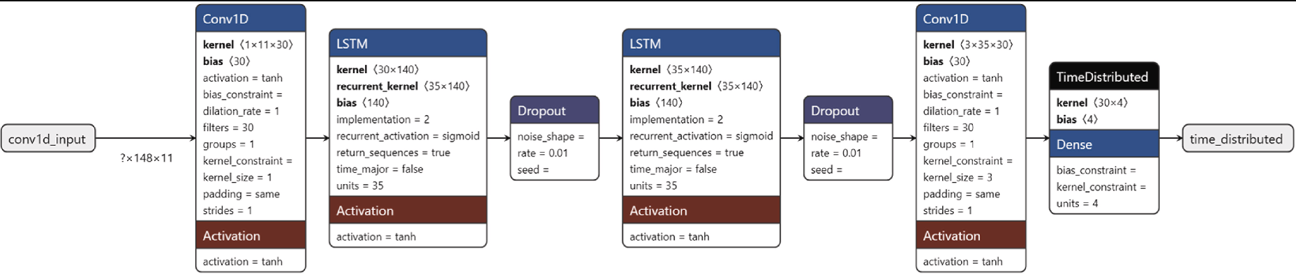 架构首先使用一维卷积层(Conv1D),随后是两层叠加的长短期记忆(LSTM)层(加上中撤层),然后是Conv1D层和稠密层(时间分布层)。