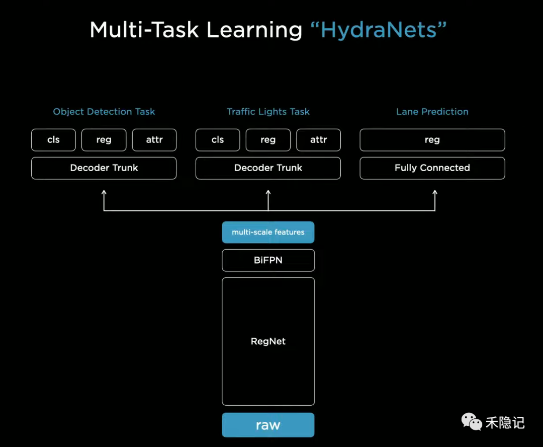 HydraNet (九头蛇网络): 引入巨大的 RegNet 主干网络,共享视觉特征,然后分出不同的"头"负责车道线、车辆、红绿灯检测。