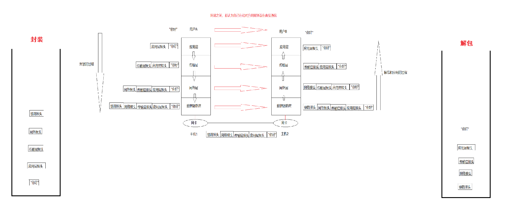 通过上面的例子我们就对封装和解包有了一个初步的认识,那么下面我们就来看看这些层级之间是如何进行封装和解包的: