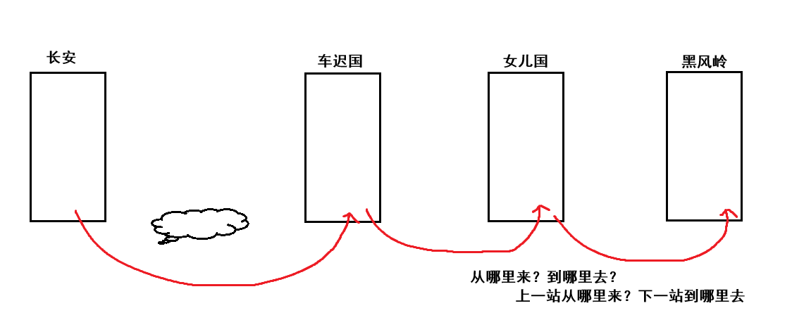 这里用我们很熟悉的西游记来举例,假设现在唐僧四人要去西天取经,这一路上要经过上面所示的三个地方,分别是:车迟国,女儿国和黑风岭,而他们每到一个地方那里的妖怪都会问他们:" 你们从哪里来?要到哪里去啊? "