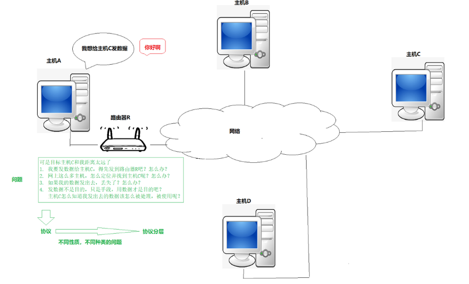 就比如上面的主机A要向主机C发发送信息,那么因为距离变长了,就需要考虑上面的几个问题: