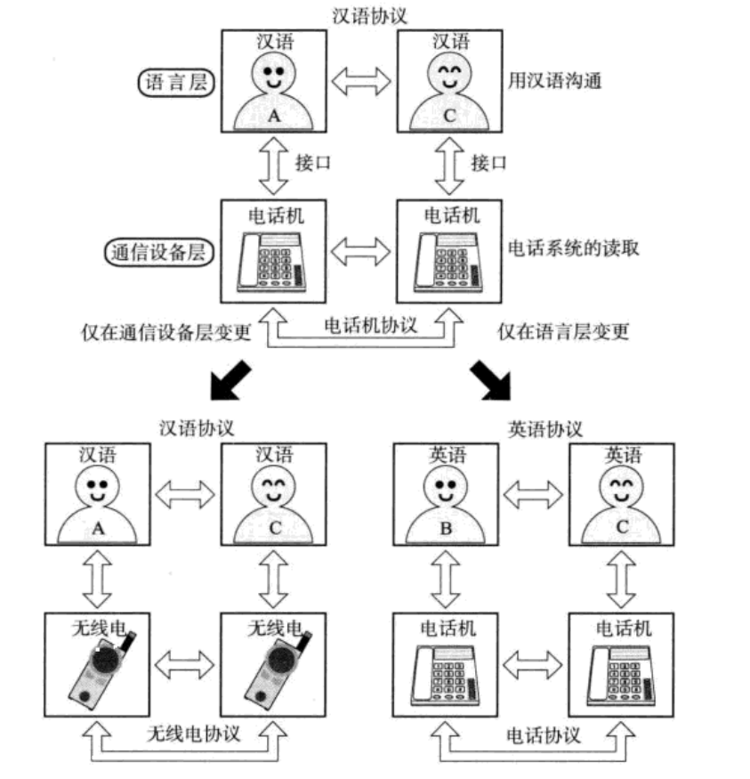 在上面的例子中,我们的"协议"只有两层:语言层,通信设备层。可以很明显的看到,不同的层级,区别还是很大的。