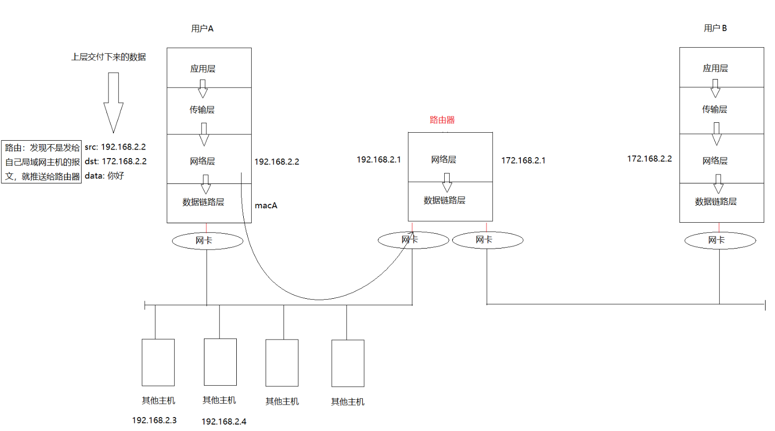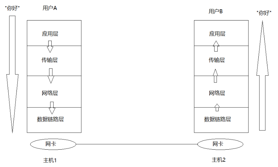 由左边的用户A向右边的用户B发送消息,按照网络协议栈的顺序从上到下一层一层地进行传递。