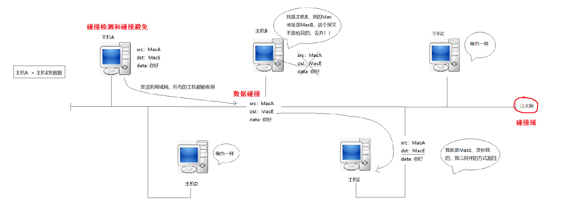 并且我们从上图中也可以看到,不只是主机E能够收到主机A发出的信息,其他的主机也是能够收到信息的,并从信息中判断出这不是发给自己的,这并不难理解,在上面教室的例子中,老师提问某个学生,其他的学生也是能听到的,并且知道老师喊得不是自己,因为喊得不是自己的" 名字 "。