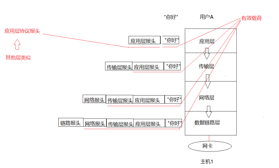而对于它下面的传输层而言,上面传下来的应用层报头+" 你好 "就是有效载荷,而它要在其外部封装一层报头。