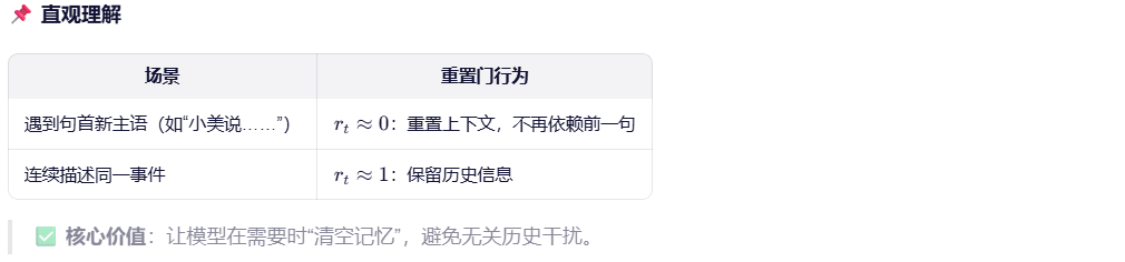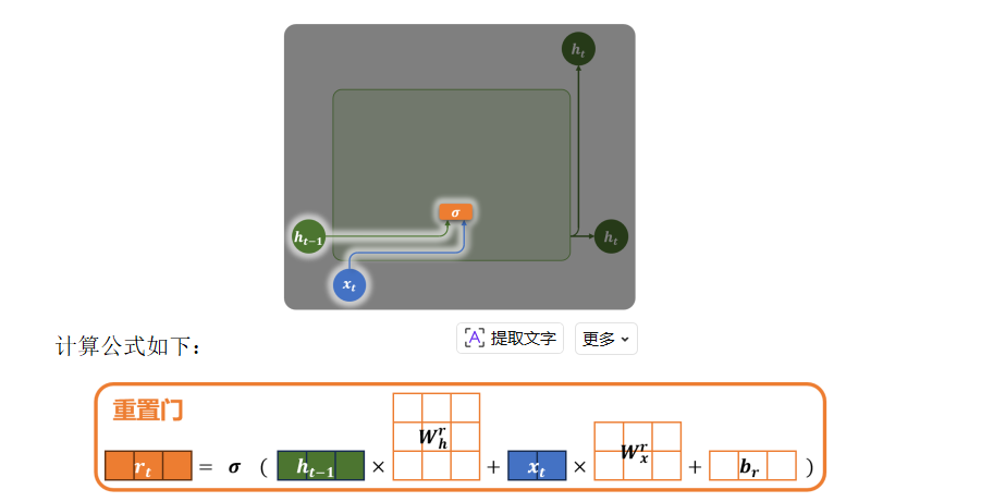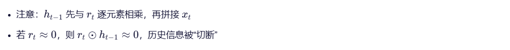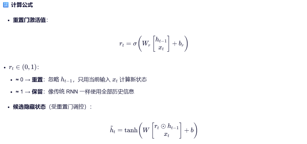 - 重置门(Reset Gate)→ 决定是否忽略过去状态