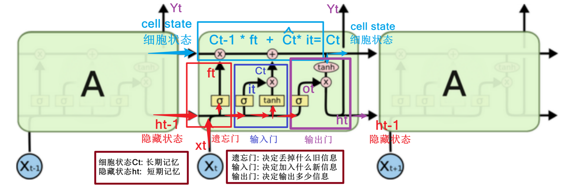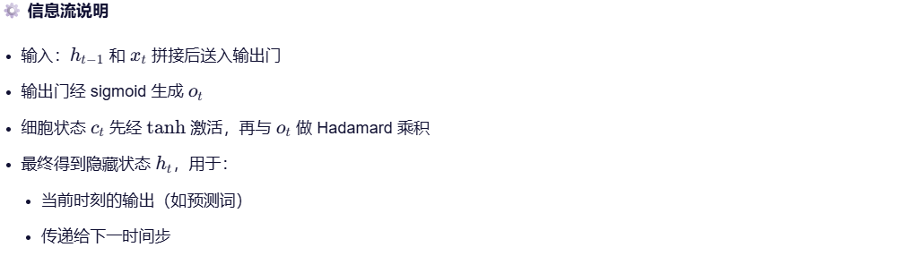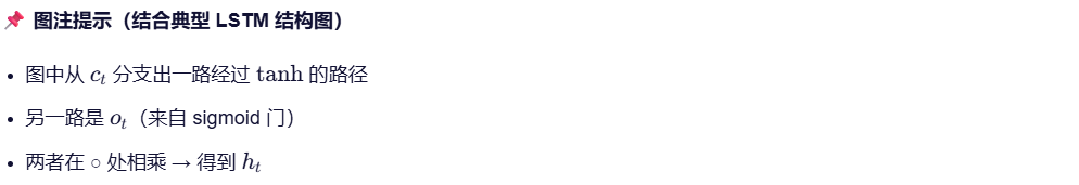- 隐藏状态 h_t 是基于 c_t 和当前输入计算出的输出,反映当前时刻的"短期上下文"