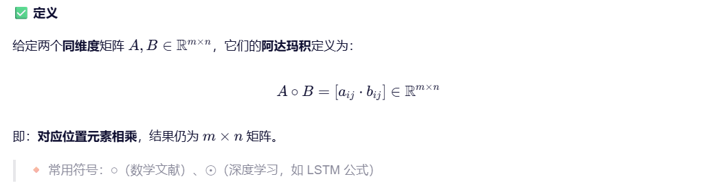 ✅ 在 NumPy / PyTorch / TensorFlow 中,* 默认执行逐元素乘 → 即阿达玛积