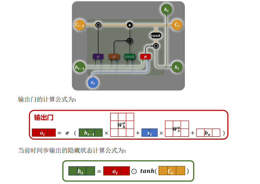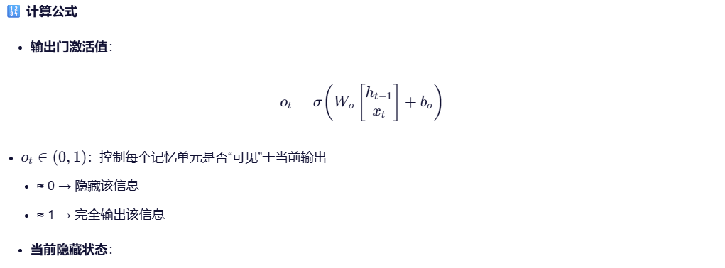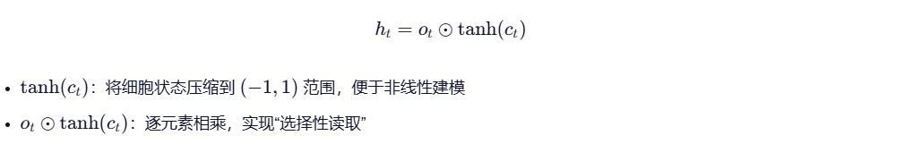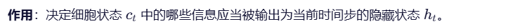 - 输出门(Output Gate) :决定 Ct的哪些部分将输出为隐藏状态 ht。