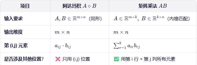 - 阿达玛积:局部操作 ------ 两个矩阵"对位相乘",不混合不同位置的信息。