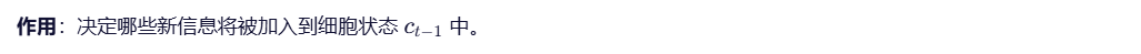 - 输入门(Input Gate):决定哪些新信息将被加入到 Ct。
