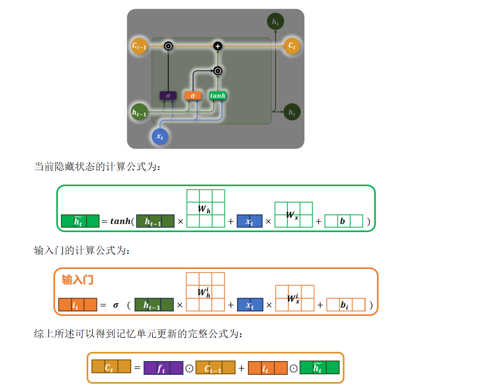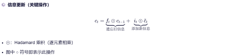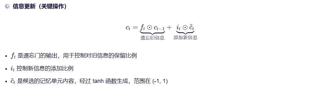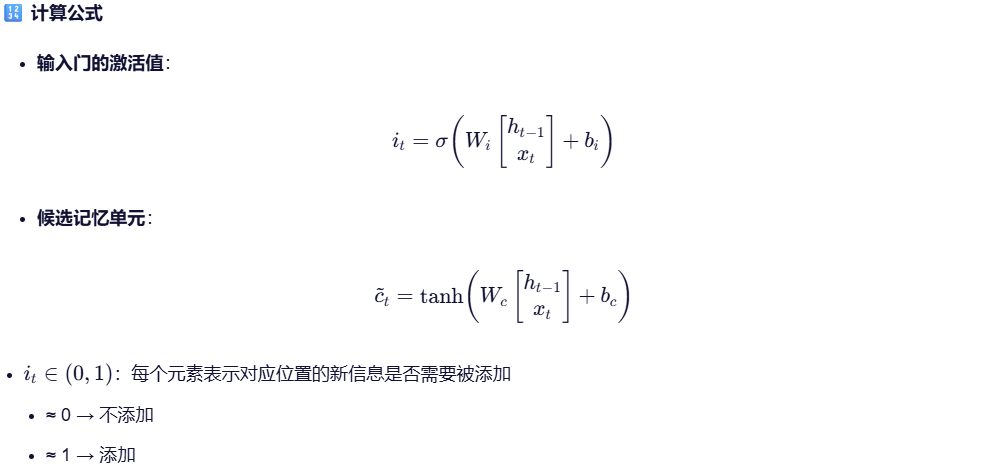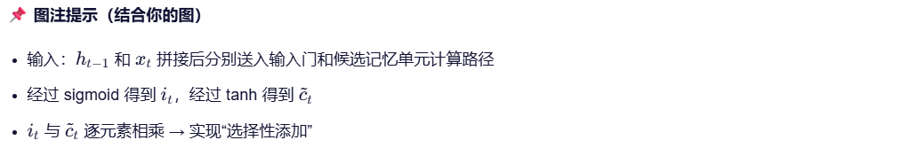 💡 核心思想:通过输入门和候选记忆单元的协同工作,实现对细胞状态的选择性更新。输入门决定哪些部分应该被更新,而候选记忆单元提供新的候选信息来替换旧的信息。
