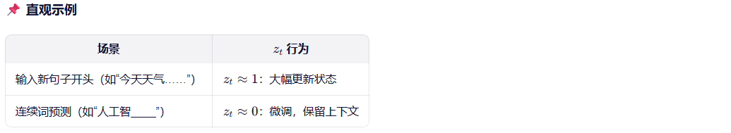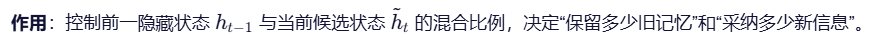 - 更新门(Update Gate)→ 决定新旧状态如何融合