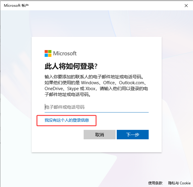 在弹出的向导框里,底部小字 选择 "我没有这个人的登录信息" (图2)→ "添加一个没有 Microsoft 账户的用户" (图3)