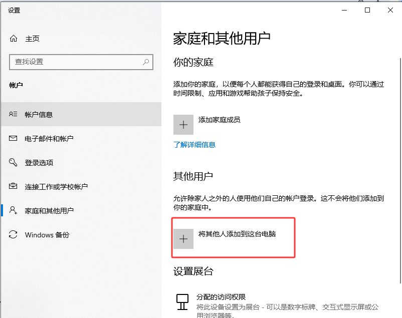 Win + I → 账户 → 家庭和其他用户 ,点击 "将其他人添加到这台电脑" ,如图1。
