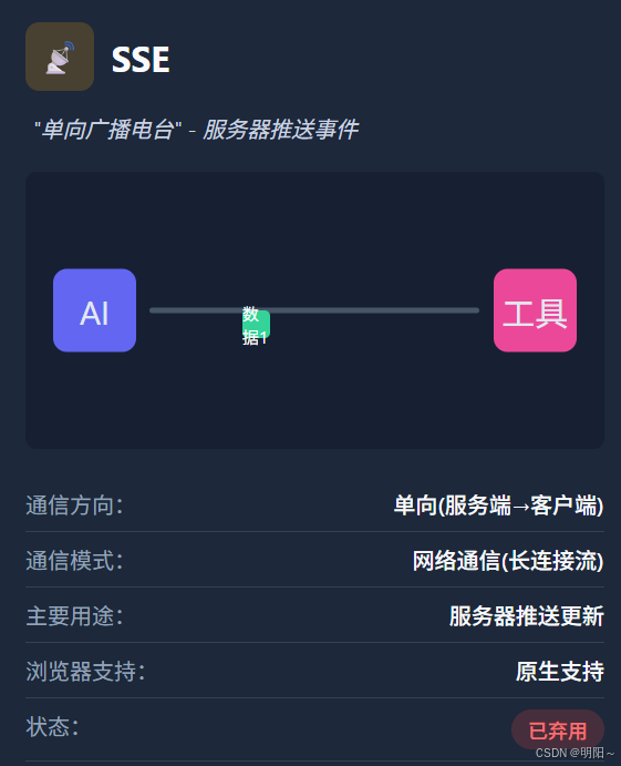 类型:SSE 是一种 基于 HTTP 的单向推送协议 ,它允许服务器在保持连接开放的情况下,持续向客户端发送事件流。