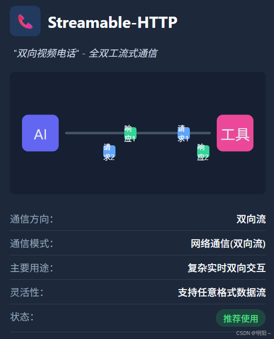 类型:Streamable-HTTP 是 MCP 提供的另一种基于 HTTP 的传输方式,它同样用于网络通信。