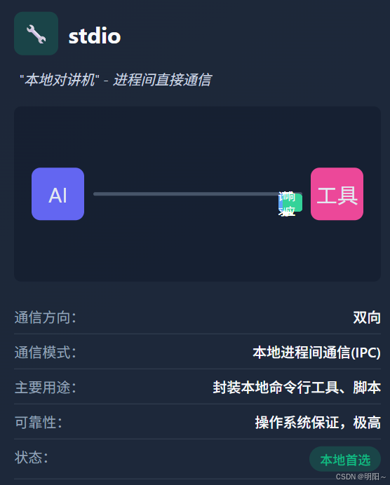 适用场景:非常适合在本地环境中,将一个命令行工具或脚本快速封装成一个 MCP 服务。