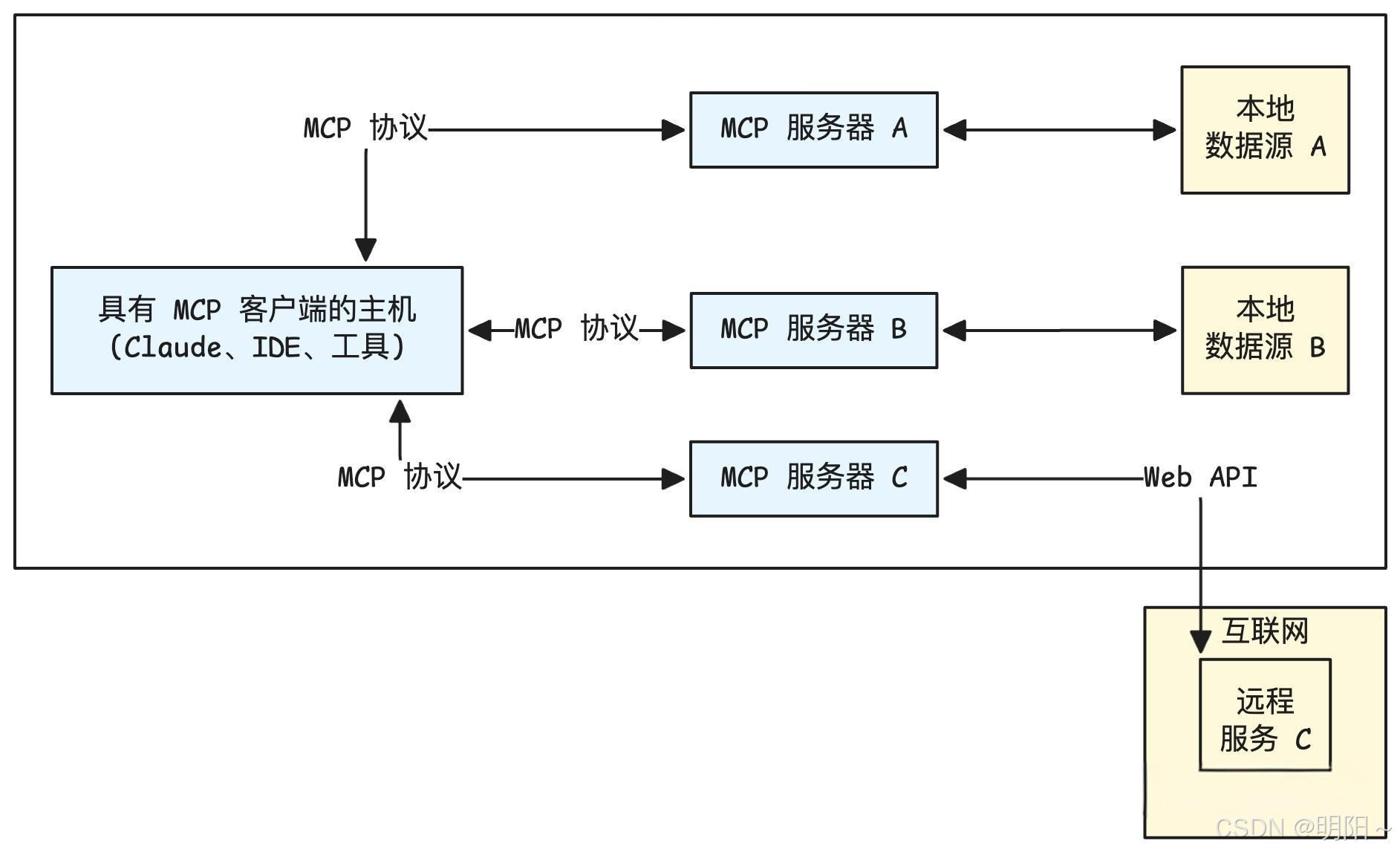 注意:此前在早期版本中,MCP 曾使用 "HTTP + SSE" 这种组合(客户端 POST、服务器 SSE 推送)作为远程通信方式。然而,该 "HTTP + SSE" 方式在规范中已被标注为 已弃用(deprecated),从 MCP 规范 2025-03-26 起推荐转向 Streamable HTTP。